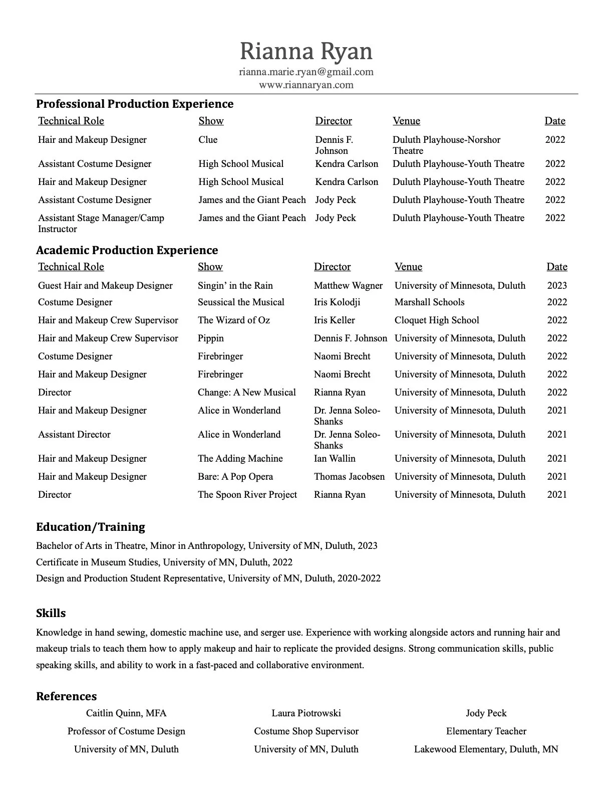 Rianna has been involved in theatre, music, and fine arts since she was little. She attended The University of Minnesota-Duluth where she received a BA in Theatre with a minor in Anthropology and a Museum Studies Certificate.